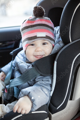 Happy and smiling toddler sitting in baby car seat on back of the car