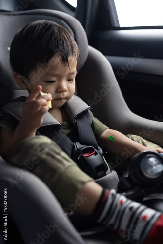 Happy Asian Chinese age 1-2 years old kid enjoying his food while sitting on safety car seat