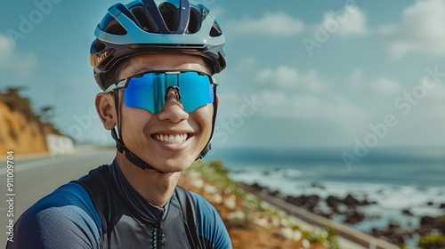 Happy Asian man cycling against a seashore backdrop