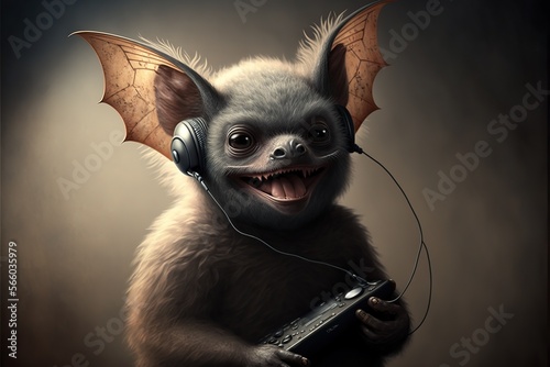 Happy bat wearing headphones, concept of Music Appreciation and Self-Expression, created with Generative AI technology