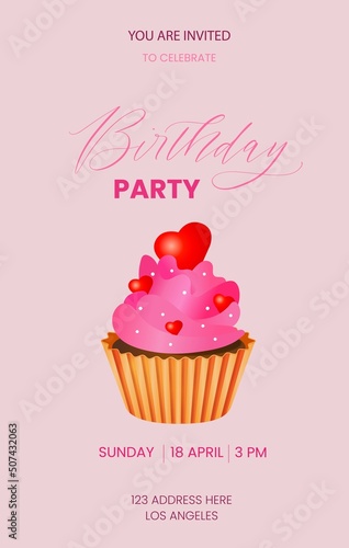 Happy birthday vertical invitation card with golden sparkling dots, balloon, cake, candle, star. Vector typography hand drawn lettering color illustration for birthday celebration. Web design or print