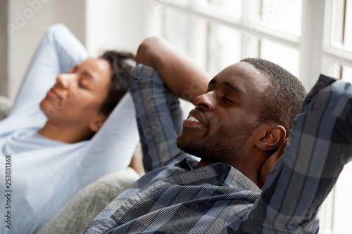 Happy black couple relax on couch hands over head
