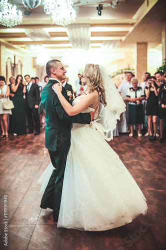 Happy bride and groom dancing alone on the dance floor their first wedding dance.