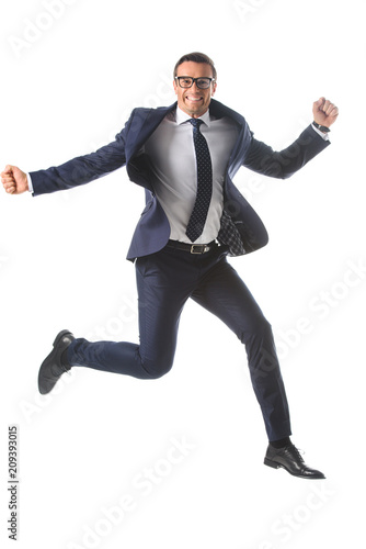 happy businessman in eyeglasses jumping and gesturing by hands isolated on white background