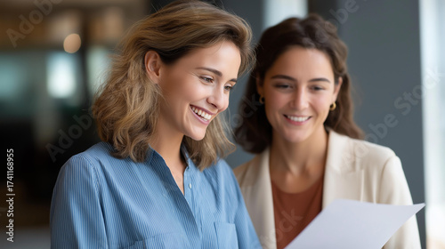 Happy businesswoman enthusiastically discussing detailed financial report with female coworker while standing in bright modern office space | financial discussion office