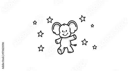 Happy cartoon baby elephant dancing amidst twinkling stars, a playful black and white line art illustration perfect for kids' designs.