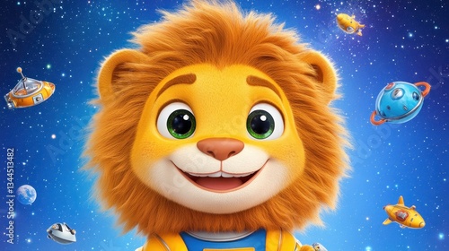 Happy cartoon lion astronaut in space with rockets.