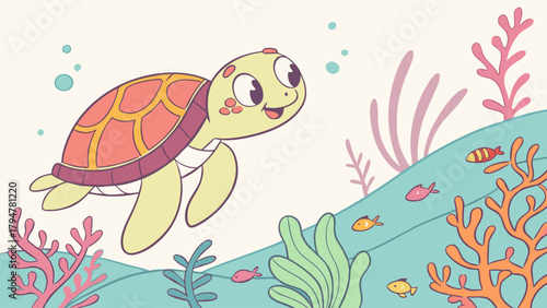 Happy Cartoon Sea Turtle Swimming Underwater with Colorful Coral Reef and Fish. Cute Marine Life Illustration for Kids Education and Ocean Conservation.