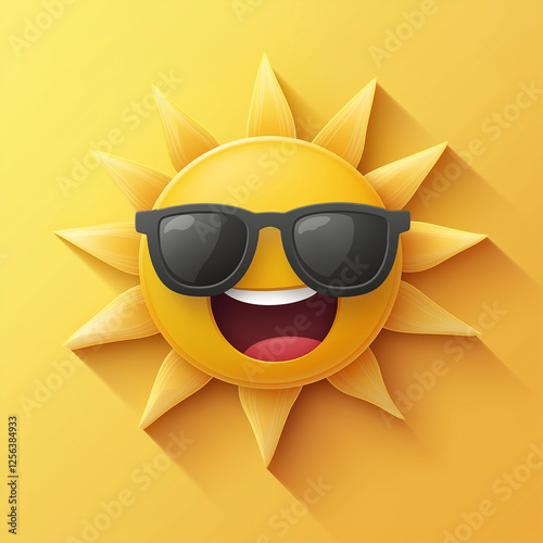 Happy cartoon sun emoji with sunglasses smiling on bright yellow background symbolizing summer, fun, happiness, warmth, positivity, digital illustration, and cheerful sunny weather