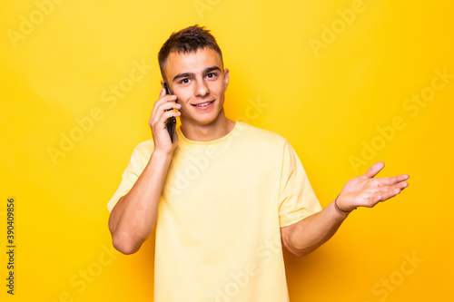 Happy cheerful smiling man talking on phone, isolated on yellow background