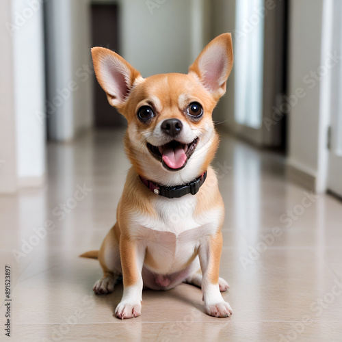 Happy Chihuahua Puppy with Black Collar in Bright Hallway Generative AI