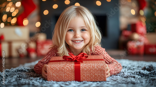 Happy child hugging christmas gift in decorated room