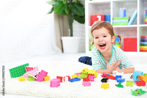 happy child laughing and playing with toys constructor