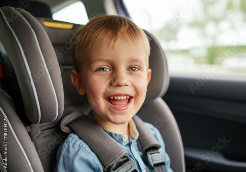 Happy child smiling in a car seat during a family road trip in a sunny afternoon