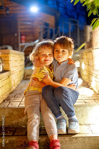 Happy children oudoors at night, having fun laughing and enjoying warm spring night