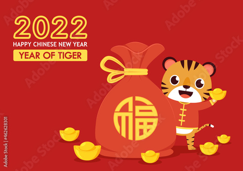 Happy Chinese new year 2022 poster. Happy Chinese new year greeting card 2022 with cute tiger. Tiger character design.