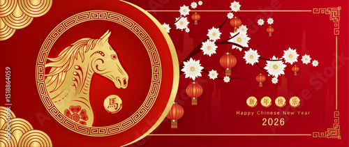 Happy Chinese New Year 2026. Horse gold zodiac sign on red background with flower lantern teng lang for festival banner or card design. Translation Happy new year, Horse. Vector EPS10.