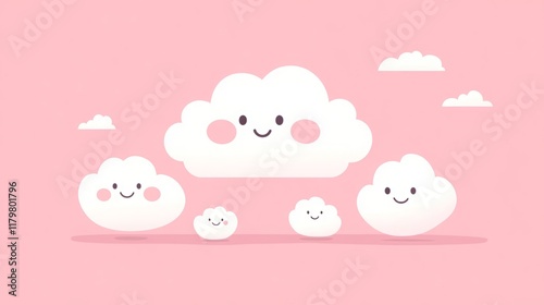 Happy clouds float in a pink sky. Sweet and cheerful illustration.