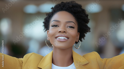 Happy confident afro woman wearing stylish yellow blazer with arms raised smiling in city background symbolizing success, positivity, empowerment, and modern lifestyle happiness