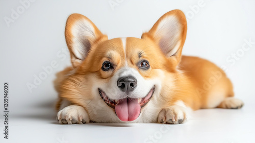 Happy corgi lounging comfortably indoors with a joyful expression and bright eyes