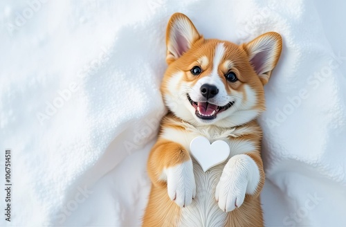 Happy corgi puppy lying in the snow showing a heart-shaped tag on a sunny winter day