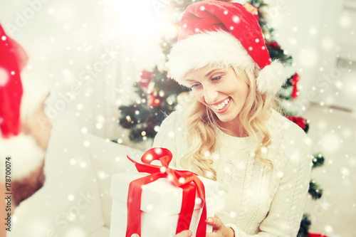 happy couple at home with christmas gift box