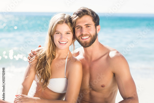 Happy couple relaxing together in the sand