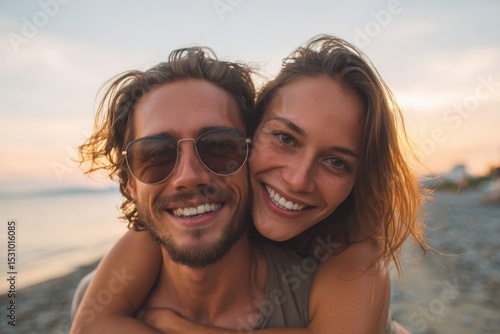 Happy couple smiling and enjoying sunset at the beach