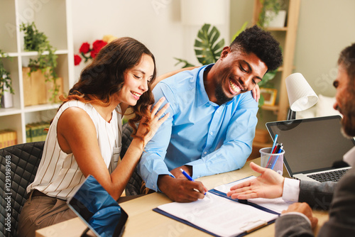 Happy couple smiling and signing contract with financial advisor