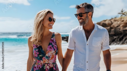 Happy Couple Walking On Beach