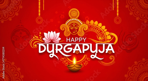 Happy Durga Puja, Red Festive Background with Goddess Durga Face