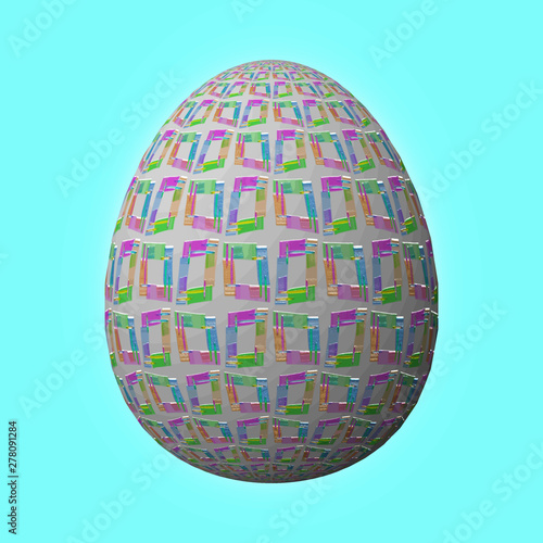 Happy Easter - Frohe Ostern, Artfully designed and colorful easter egg, 3D illustration on turquoise background