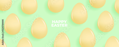 Happy Easter festive banner. Yellow glossy Easter Eggs on green background. Vector illustration.
