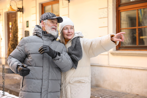 Happy elderly couple walking on city street