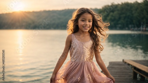 Happy expressive European girl dressed in a lush dress, on a pier by a lake against a serene sunset background.