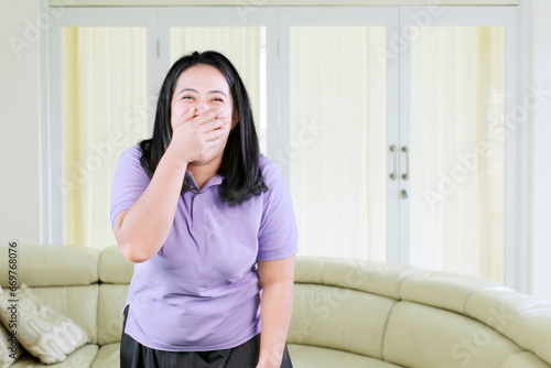 Happy extrovert young fat girl wearing purple shirt expressing her happiness