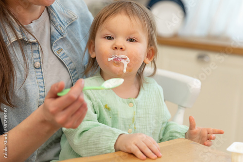 Happy family at home. Mother feeding her baby girl from spoon in kitchen. Little toddler child with messy funny face eats healthy food at home. Young woman mom giving food to kid daughter.