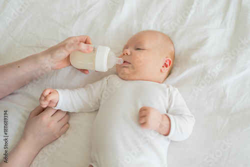Happy family at home. Mother hand nursing feeding little baby toddler child milk from bottle. Newborn Infant baby girl sucking eating drinking milk. Mom of breast feeding baby. Motherhood happy child