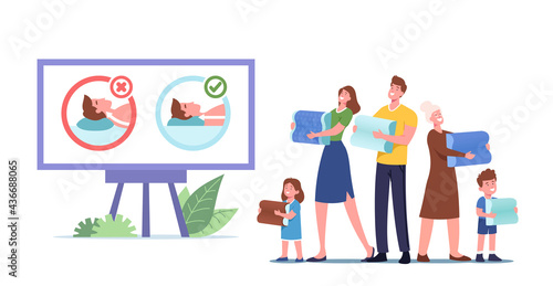 Happy Family Characters Choose Medical Orthopedic Pillows for Healthy Comfortable Sleep. Mother, Father, Granny and Kids