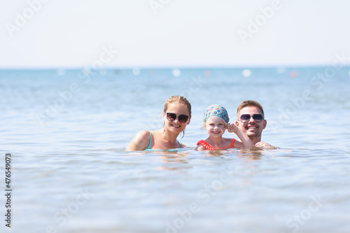 Happy family posing for picture together in sea or ocean