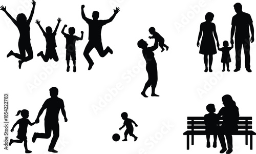Happy family silhouettes with parents and children playing jumping together isolated on white background parenting lifestyle concept vector illustration black