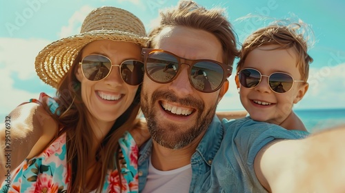 Happy family spend good time on the beach together taking selfie. copy space for text.