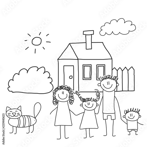 Happy family with children. Kids drawing style vector illustration. Mother, father, sister, brother.