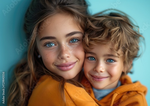 happy fashion caucasian mother wearing bright sweatshirt, lovingly embracing her smiling kid