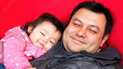 Happy Father Embracing His Adorable Daughter Against a Bright Red Background