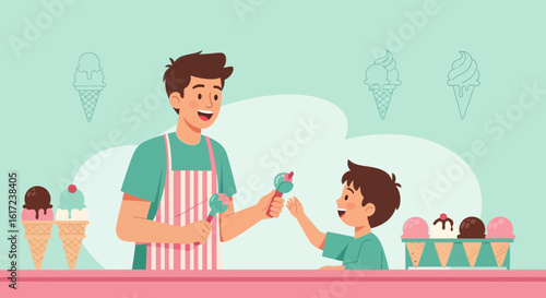 Happy Father Gives Ice Cream To His Son On Summer Day Illustration
