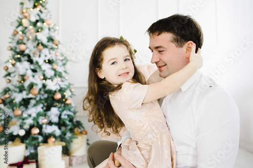 Happy father holds his little pretty girl in peach dress standing before a Christmas tree