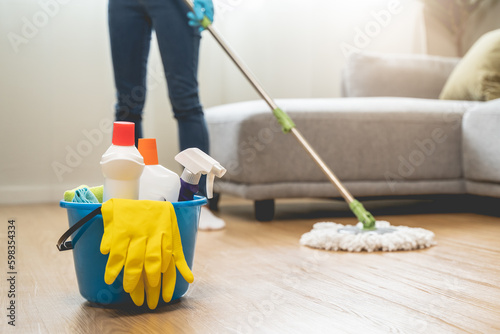 happy Female housekeeper service worker mopping living room floor by mop and cleaner product to clean dust.