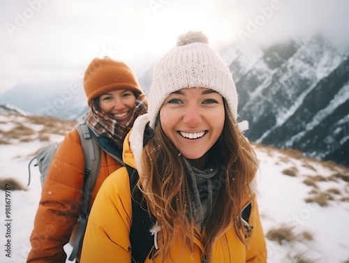happy Friends enjoying snow on background of mountains. having fun spending winter vacation in mountains Travel in winter