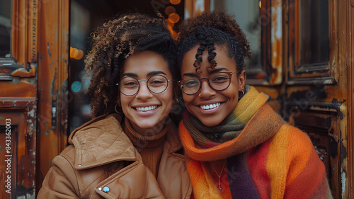 Happy gay couple sitting together in front of door,generative ai